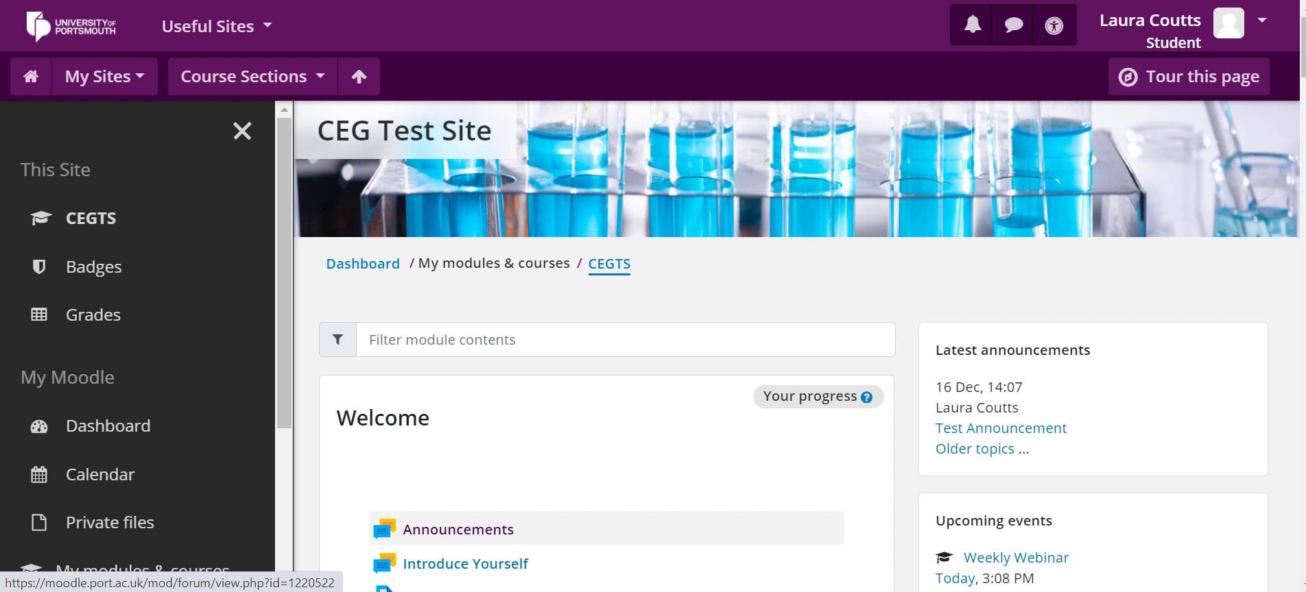 When logging into Moodle for the first time, take the Moodle tour. This really useful tool shows you all the main features of Moodle. You can take the tour as many times as you want by clicking on the icon on the top right of the webpage.